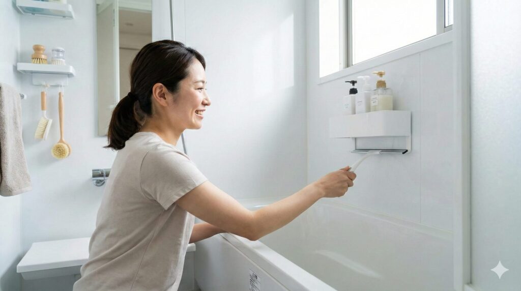 ラックの位置決めで迷ったら、見栄えではなく入浴中の動作を先に並べると判断が早いです。立つ、しゃがむ、振り向く、片手で取る。これらの動きが多いほど、取り出しのたびに水滴が飛び、置き直しも雑になりやすいです。どこでもラックは付け替えられるため、実際に体を洗う場所で「取る→使う→戻す」を試し、最小の動きで完結する高さへ寄せるのが基本になります。