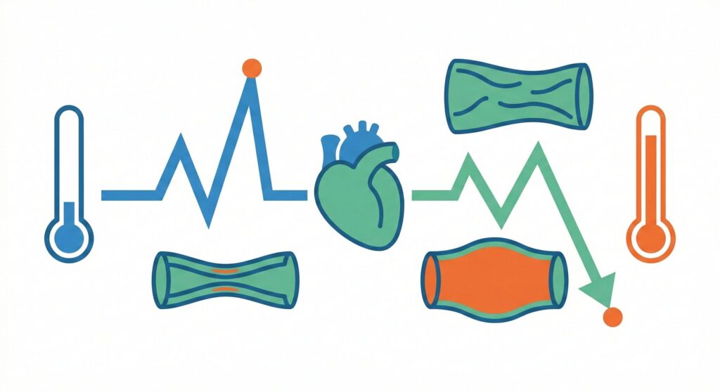 私たちの体は、周囲の気温変化に反応して体温を一定に保とうとする優れた機能を備えています。しかし、冬の脱衣所での急激な冷えに直面した際、その調整機能は限界を超えたストレスを血管に強いることになります。体温が逃げないよう瞬時に血管を収縮させることで血圧は跳ね上がり、その過酷な負荷は目に見えない形で心臓や脳へと蓄積されていきます。