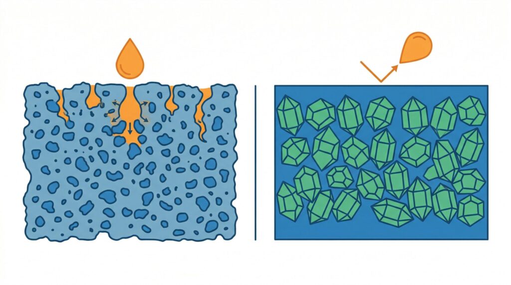 天然石は微細な穴が開いているため水分を吸い込みやすい欠点がありますが、クォーツストーンは樹脂で高密度に固めているため隙間がありません。調味料などの液体が内部に浸透せず、サッと拭くだけで清潔さを保てるのが大きな利点です。
